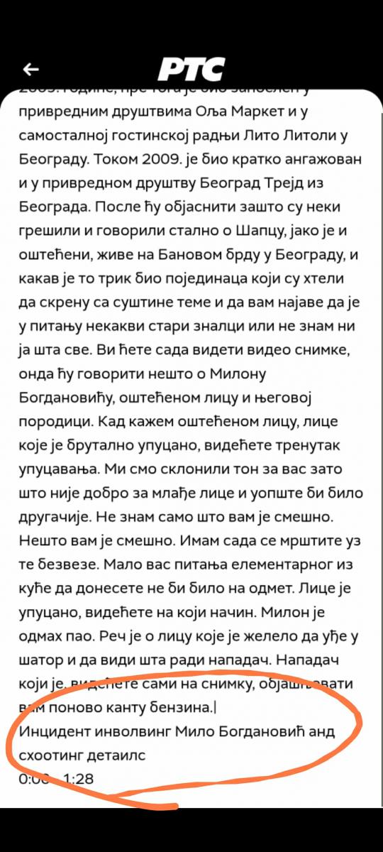 Ipak, na vama je da sve to još jednom proverite, da ne biste prošli kao RTS. Izveštavajući sa jednog od mnogobrojnih obraćanja predsednika Aleksandra Vučića, javni servis Srbije objavio je traljavi zapis u kom se upucani čovek – Milan – sve vreme naziva Milon („govoriću nešto o Milonu“; „Milon je odmah pao“). Tekst obiluje i drugim greškama, a da je reč o mašinski generisanom transkriptu svedoči i završetak objave na engleskoj ćirilici: „Инцидент инволвинг Мило Богдановић анд схоотинг детаилс, 0:00-1.28”.
