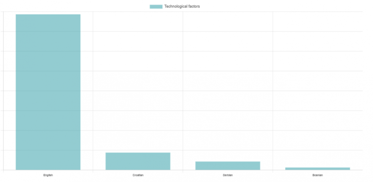 Prema podacima projekta Evropske jezičke jednakosti (ELE) o digitalnoj jednakosti jezika, postoji značajan jezički jaz među engleskog i većine evropskih jezika. Prikaz ispod pokazuje razlike u tehnološkim faktorima – vrste, broja i kvaliteta resursa i podataka za mogućnost dalje obrade te njihove dostupnosti, odnosno mogućnosti slobodnog pristupa.