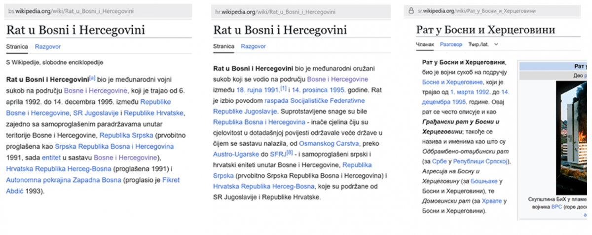 U praksi, problem je i neprohodnost Wikipedije kada se istražuju teme koje su značajne u Bosni i Hercegovini i široj regiji. Pojedine teme koje su posebno osjetljive, kao što je “Rat u Bosni i Hercegovini”, uvezane su prijevodom i jasno se mogu vidjeti razlike u sadržaju. Verzija ovog članka na shwiki je ocijenjena kao kvalitetan članak.