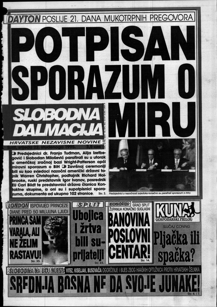 „Slobodna Dalmacija“ informiše čitaoce da je „potpisan sporazum o miru“. „Vjesnik“ također donosi vijest na naslovnici „Potpisan sporazum o miru u BiH“, karakterišući ga kao „svjetski događaj godine“. Splitski dnevni list donosi vijesti i o podizanju optužnice protiv čelnika HVO-a i „Herceg-Bosne“ uz naslov „Srednja Bosna ne da svoje junake!“ Haške optužnice, i još više nemogućnost haških optuženika da se aktivno bave politikom, bila je tema i u sarajevskim medijima, uz kritike Tuđmanu koji je unaprijedio Tihomira Blaškića uprkos optužnici.