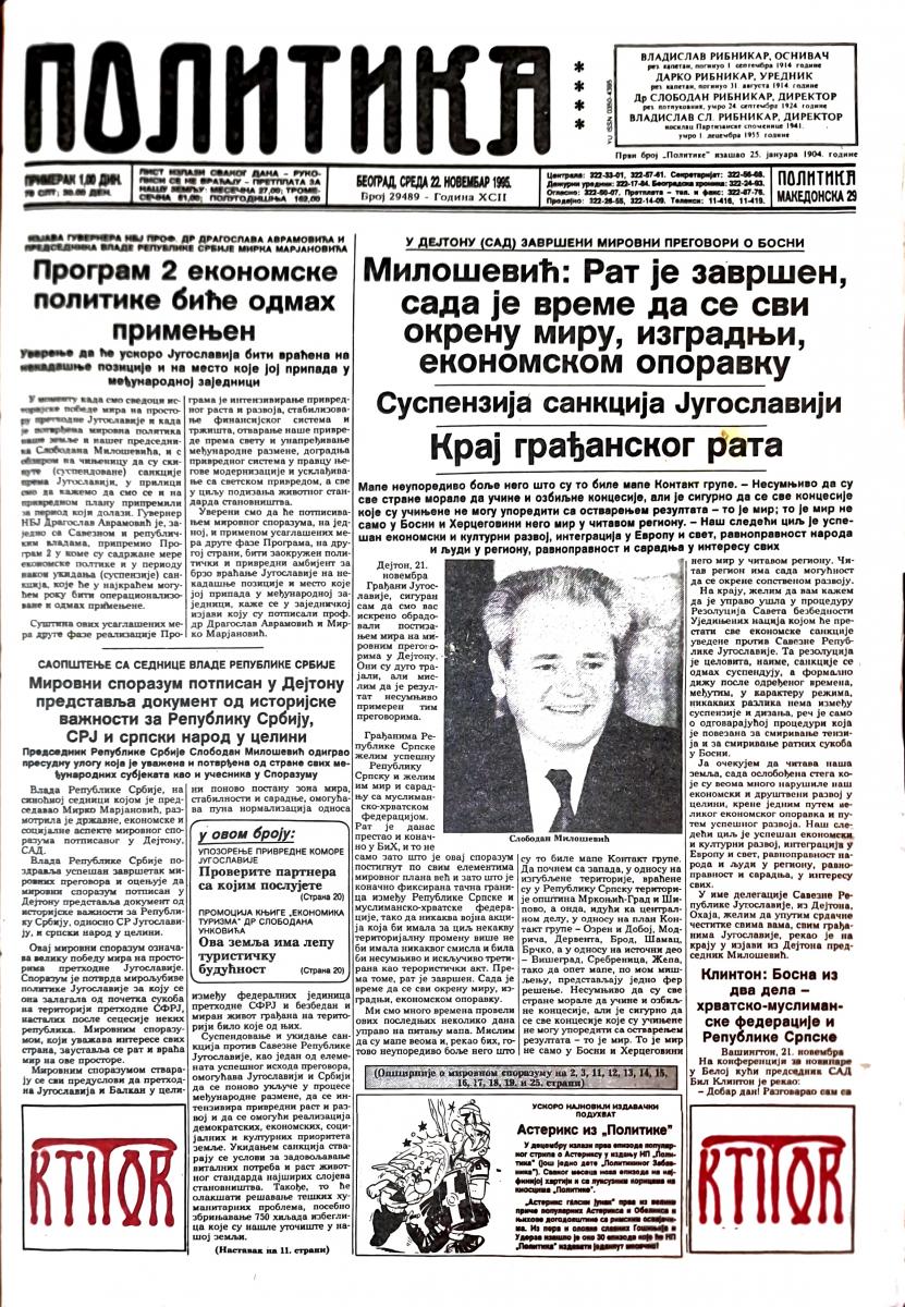 Beogradska „Politika“ na naslovnoj strani donosi izjavu predsjednika Srbije – „Milošević: Rat je završen, sada je vreme da se svi okrenu miru, izgradnji, ekonomskom oporavku“. Izjave su ovo karakteristične za Miloševića tih dana, kojeg je u sarajevskom „Oslobođenju“ Emir Habul lucidno opisao kao čovjeka koji se doima kao da „nema veze s ovim ratom, kao kakav aktivista Helsinškog komiteta s Islanda, što je vrhunac cinizma“. „Politika“ je, naravno, dosta prostora posvetila promjenama koje se tiču same Srbije i Jugoslavije (Srbije i Crne Gore), što se vidi kroz naslov „Suspenzije sankcija Jugoslaviji“, dok 23. novembra već izvještava o „kraju blokade koja je trajala 1253 dana“, a kasnije i o „povratku Jugoslavije u Ujedinjene nacije“.