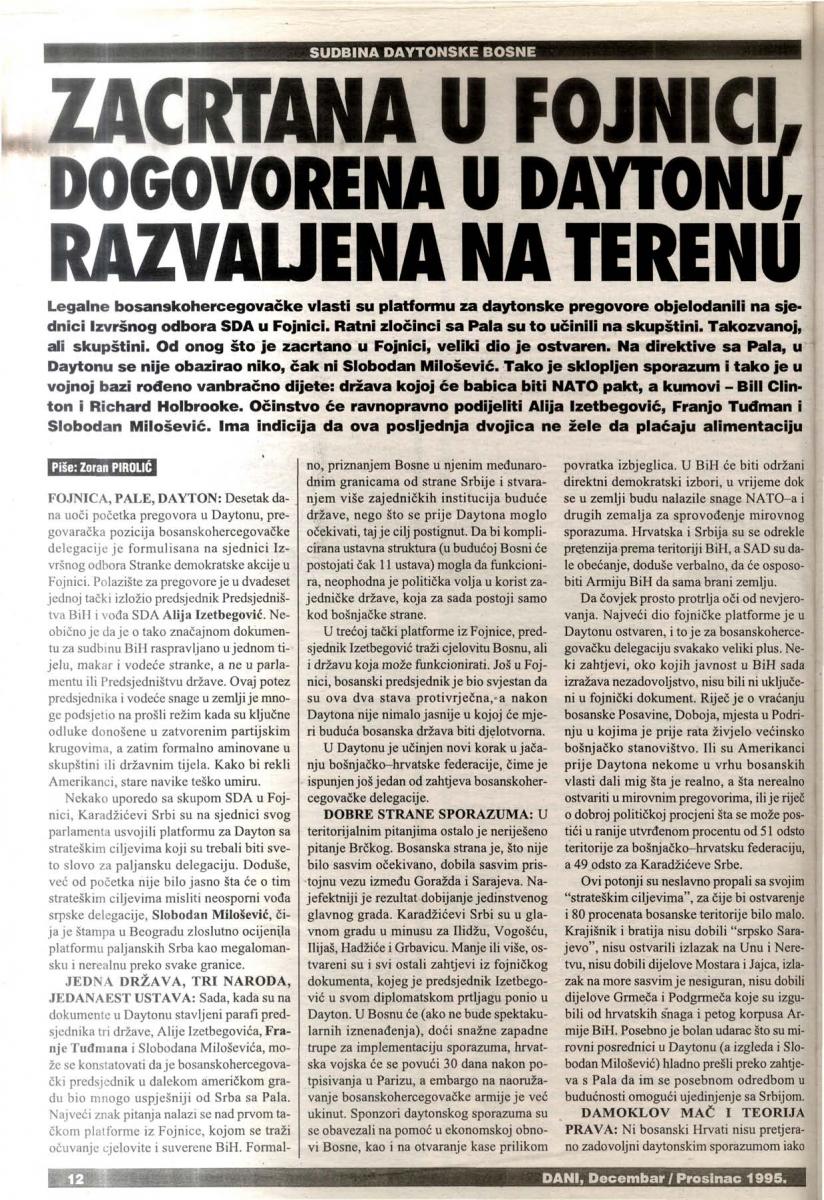 Pirolić daje pregled dotadašnjih mirovnih planova, uz obrazlaganje osnovnih principa sporazuma iz Daytona. Uz naglasak pozitivnih strana, slično kao i drugi sarajevski novinari, naglašava kako međunarodno pravo ne poznaje slično državno uređenje – o čemu ćemo mnogo slušati u narednim godinama – te kako „nije nimalo jasnije u kojoj će mjeri (država) biti djelotvorna“.