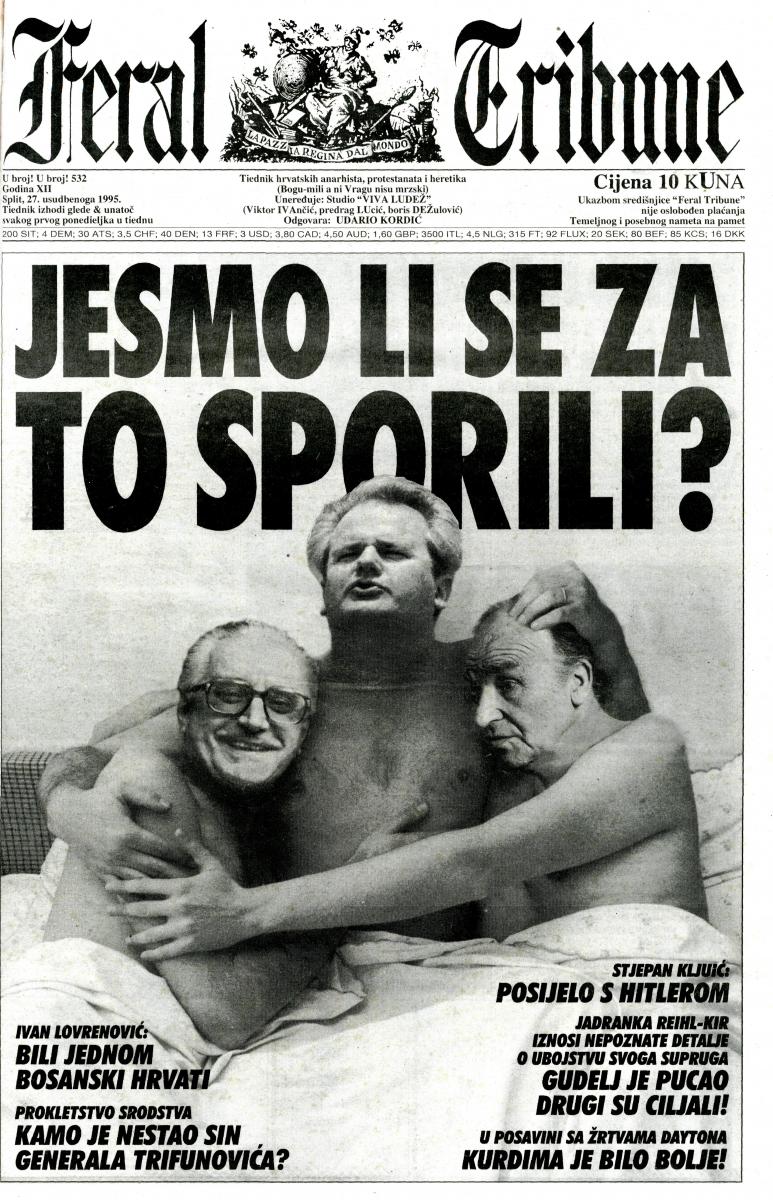 Izuzetak u hrvatskim medijima je, naravno, Feral Tribune koji je na sebi svojstven način cijelu naslovnicu posvetio Dejtonskom sporazumu uz karikaturu zagrljenih Tuđmana, Miloševića i Izetbegovića u krevetu i naslov „Jesmo li se za to sporili?“