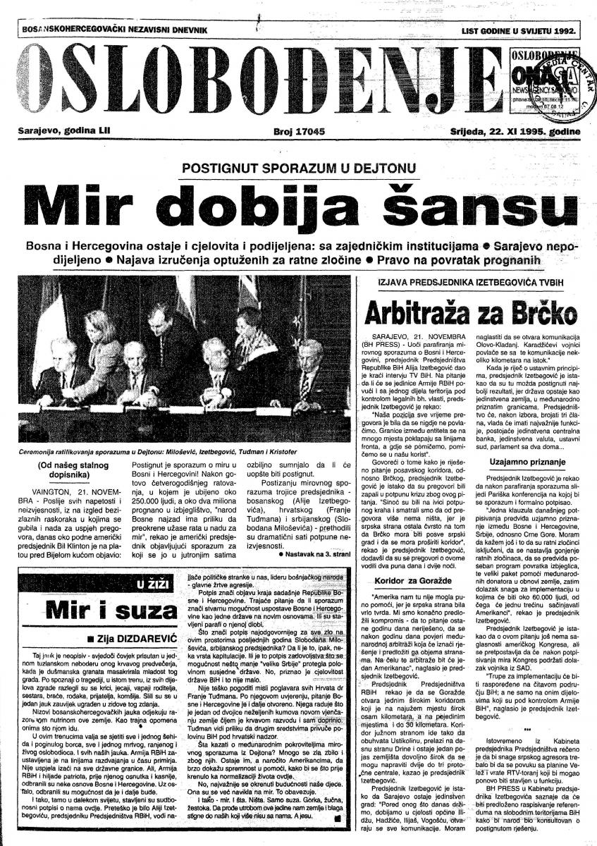 „Mir dobija šansu“ optimistična je naslovnica sarajevskog „Oslobođenja“ od 22. novembra 1995. „Oslobođenje“ donosi osnovne odredbe sporazuma, posebno se fokusirajući na pitanje cjelovitosti Bosne i Hercegovine, cjelovitosti Sarajeva pod kontrolom Federacije BiH, koridora za Goražde, te naknadne međunarodne arbitraže za Brčko. U tom trenutku teško je bilo predvidjeti kako će u svakodnevnom životu funkcionisati Bosna i Hercegovina, ali je izvještavanje „Oslobođenja“ odisalo optimizmom.