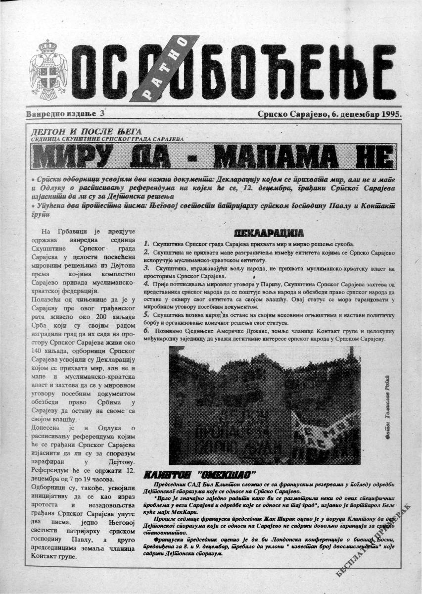 Prvo priznanje „Oslobođenja“ iz „Srpskog Sarajeva“ da je Dejtonski sporazum prihvaćen, rat završen, a Sarajevo ostalo cjelovito unutar Federacije BiH, uslijedit će u decembarskim brojevima, iako se i tada na Bosnu i Hercegovinu referiše kao na „bivšu BiH“, a „nade za multietničku BiH“ se karakterišu kao srušene. Najdalje će otići autor Zoran Žuža koji će u osvrtu pod naslovom „'Bleštavilo' licemerja“ 17. decembra 1995. godine istaći kako su „veliki kumovi još veće belosvetske političke mafije“ u Parizu krstili „još jedno svoje kretensko čedo – Uniju BiH“.