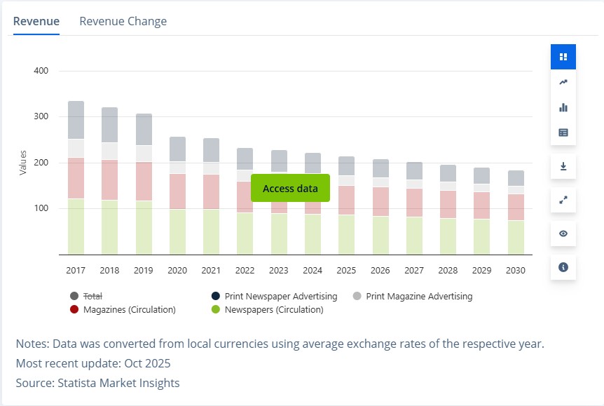 Pred našim očima se posljednjih petnaestak godina dešava transformacija. Printani mediji su na silaznoj putanji koja traje godinama. Podaci iz oktobra 2025. godine, preuzeti sa portala Statista, ukazuju na trend pada kako tiraža tako marketinga – jednako i za dnevne i sedmične novine. Jasna je razlika između 2017. i projekcije za 2030. godinu.
