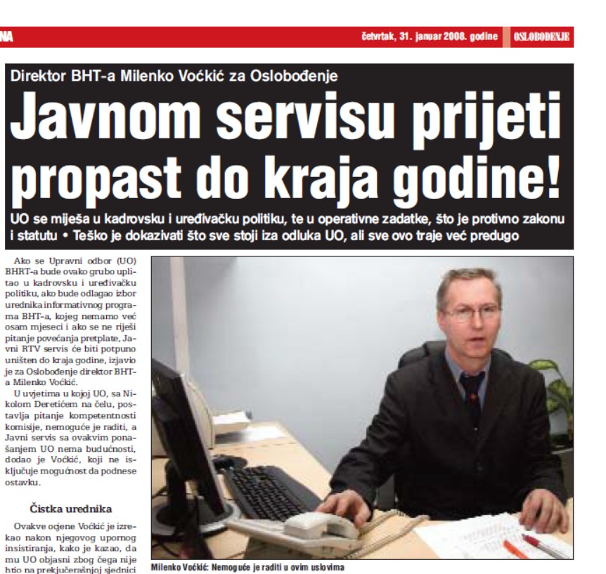 I početkom 2008. godine, tadašnji direktor BHT-a Milenko Voćkić, u Oslobođenju upozorava: „Javnom servisu prijeti propast do kraja godine“, dok Branislav Božić, tadašnji predsjednik Udruženja novinara Republike Srpske, u maju iste godine tvrdi: „BHRT-u prijeti neminovno gašenje“.